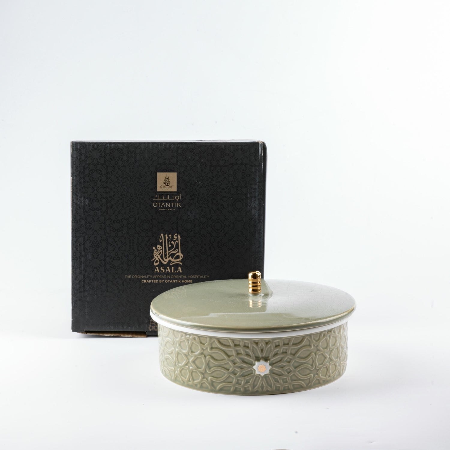 The Asala Decorative Canister is a flawless fusion of tradition and sophistication, crafted from premium porcelain to elevate your dining experience. Ideal for serving or displaying dates, this exquisite piece adds a touch of refined charm to both special occasions and everyday moments, transforming any setting into one of elegance and grace.