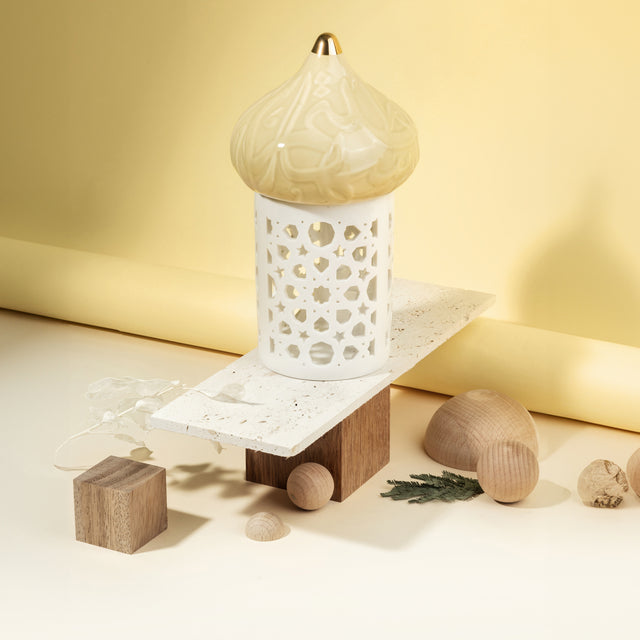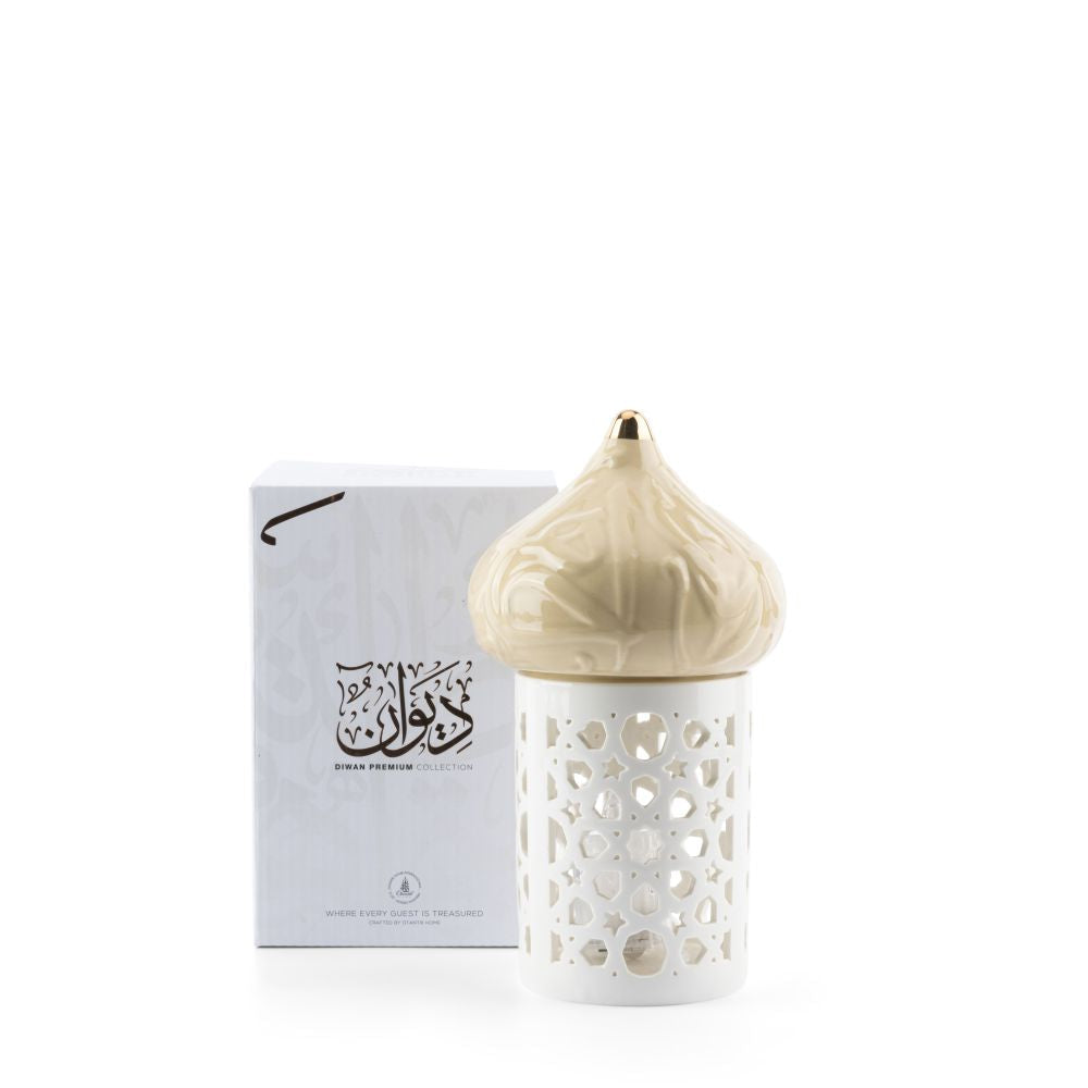 The second piece serves as a cover for the candelabra, adorned with luxurious Arabic patterns, providing added safety. It is fully decorated with the phrase, “Welcome warmly and comfortably,” which is unique to the Diwan brand.