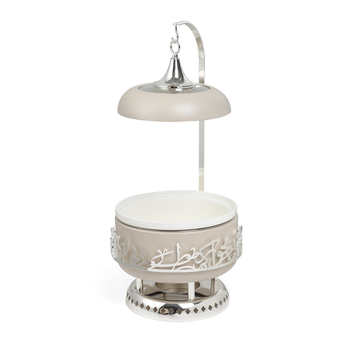 The Jiwar - 4 Liters Chafer is the ultimate choice for serving larger portions with elegance and efficiency. Built with an updated and upgraded design, this chafer features a sturdy stainless steel base that ensures durability and a modern aesthetic. The innovative water bowl system provides even heat distribution, preventing food from drying out while keeping it at the perfect temperature. The porcelain bowl offers a luxurious touch, while the transparent lid keeps your dishes protected and fresh. Designed with a lid hanger for easy storage during service, this chafer is powered by Sterno for consistent heat. Whether you're catering a large event, hosting a buffet, or preparing a family-style meal, the Jiwar - 4 Liters Chafer brings both sophistication and functionality to your dining experience.