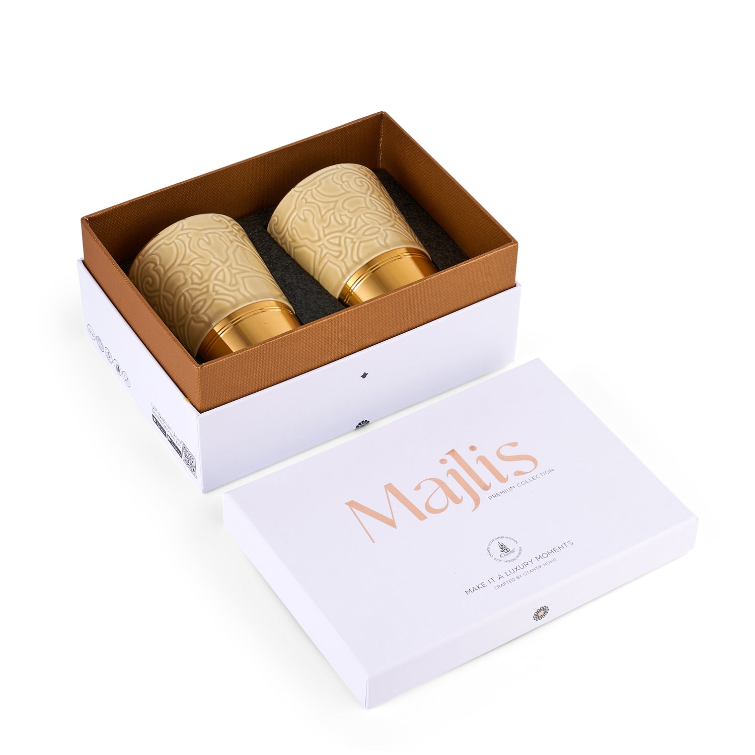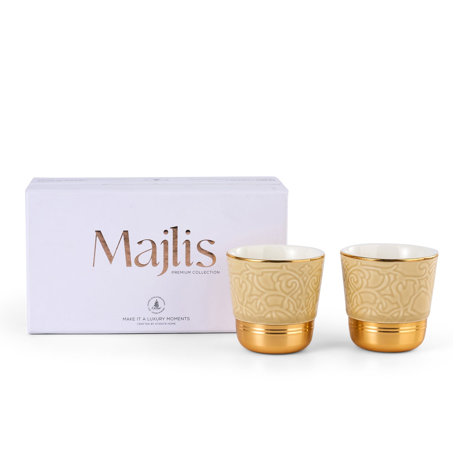 Savor every sip in timeless elegance with the Luxury Majlis Espresso Cups in glossy beige. This set of 2 refined cups captures the essence of modern luxury with its soft neutral tone and delicate gold detailing. Perfect for espresso or Arabic coffee, it adds sophistication to both everyday moments and special gatherings.