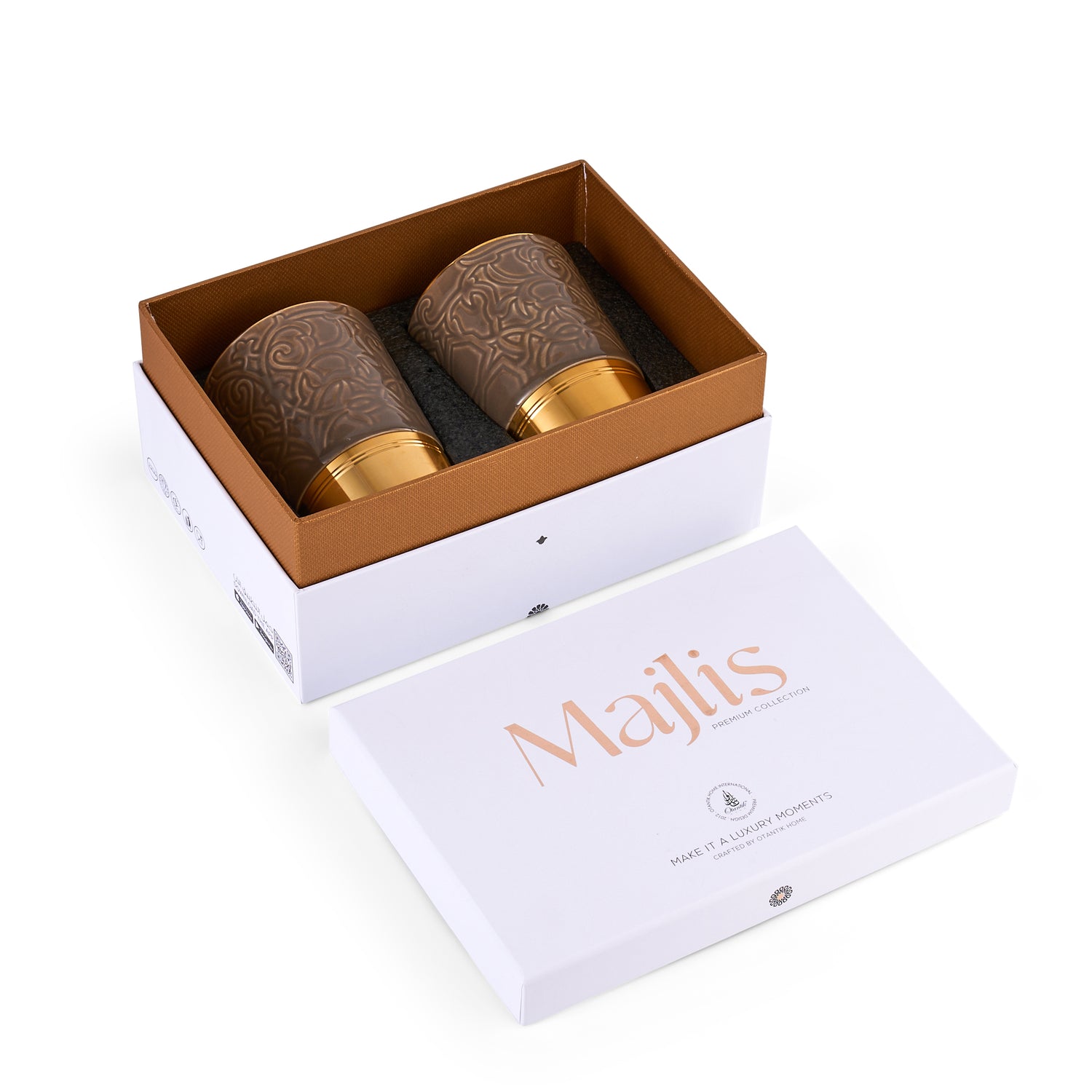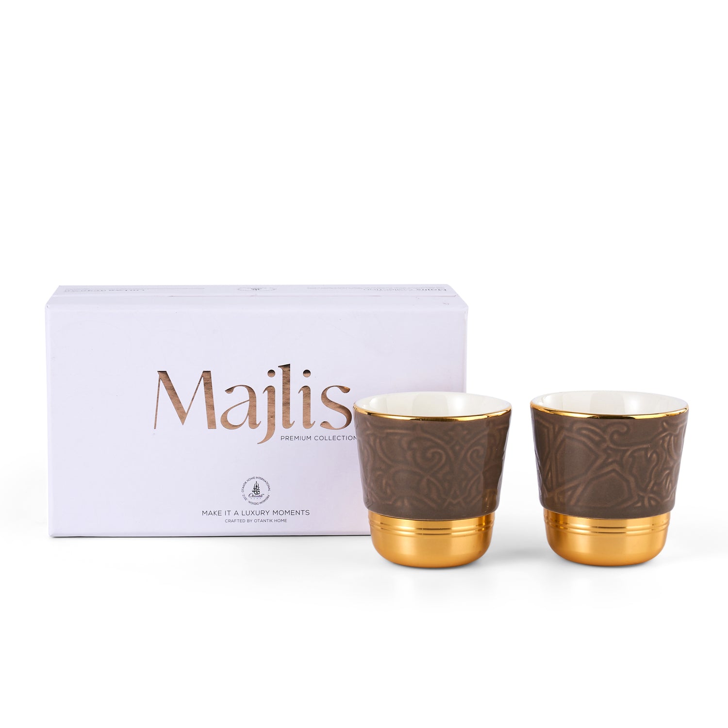 Elevate your coffee ritual with the Luxury Majlis Espresso Cups in glossy brown. This set of 2 elegant cups combines warmth, luxury, and modern design. The rich brown hue with gold accents adds a touch of sophistication, making it perfect for serving espresso or Arabic coffee with style and refinement.