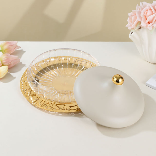 Featuring a high-quality glass bowl, it sits gracefully on a gold-plated stainless steel base, adorned with intricate Arabic calligraphy engravings that celebrate heritage and sophistication. The satin-finish stainless steel lid, crowned with a gold-tone handle, provides both functionality and refined aesthetics, keeping your treats fresh and beautifully displayed.