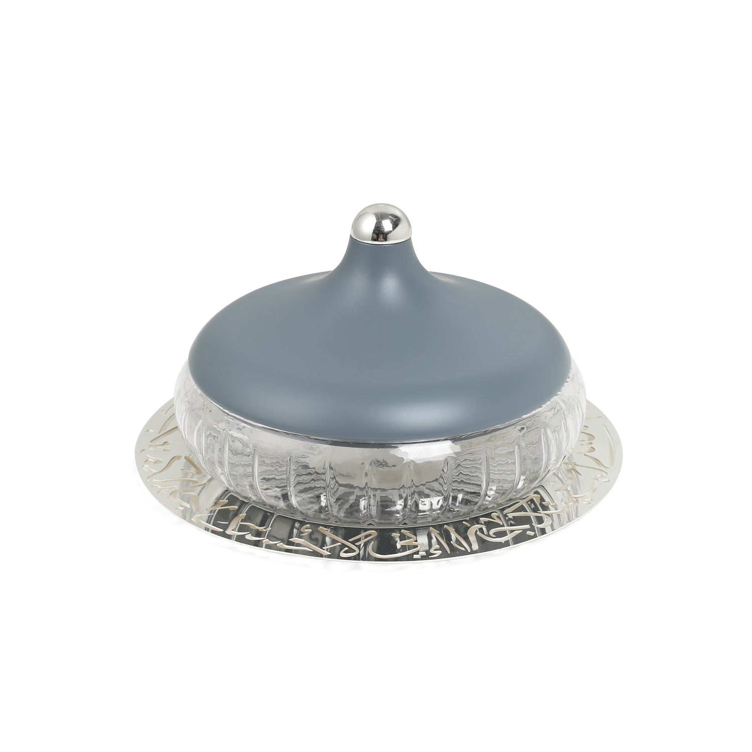 Featuring a high-quality glass bowl, it sits gracefully on a gold-plated stainless steel base, adorned with intricate Arabic calligraphy engravings that celebrate heritage and sophistication. The satin-finish stainless steel lid, crowned with a gold-tone handle, provides both functionality and refined aesthetics, keeping your treats fresh and beautifully displayed.
