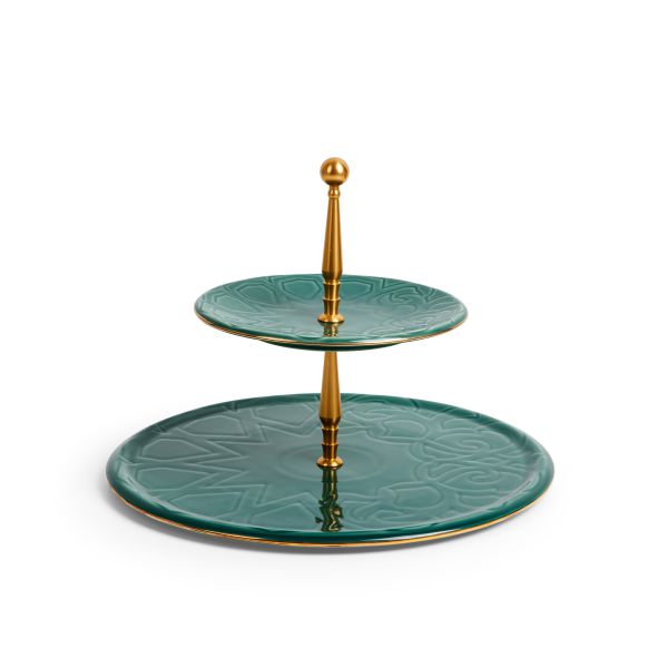 Indulge in our Luxury Majlis 2-Tier Serving Platter, designed with a stunning green and gold color scheme. Perfect for hosting parties and impressing guests. Elevate your dining experience with this unique and elegant piece. Keep your serving game strong!