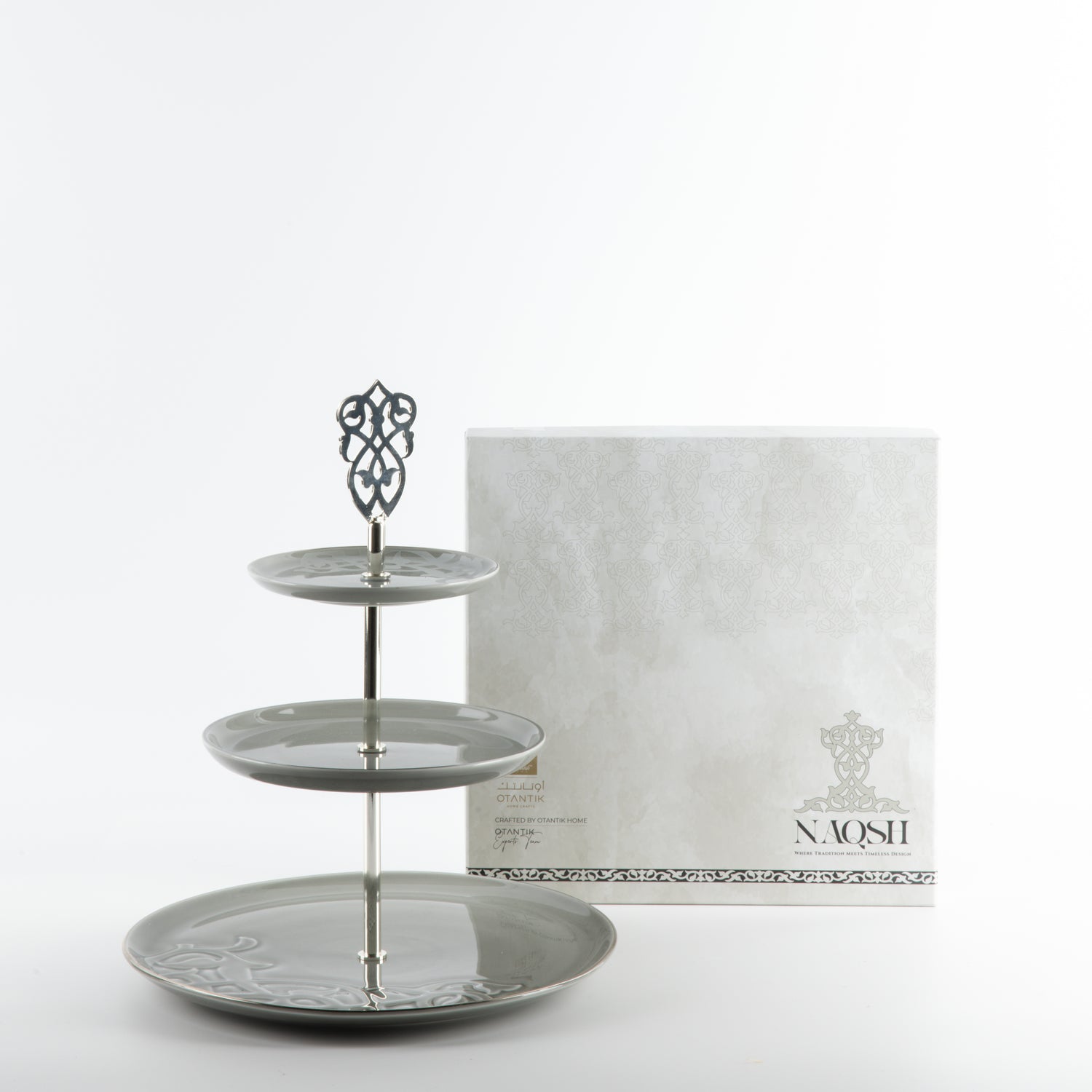 Crafted with precision and adorned with Otantik’s signature design language, each tier reflects balance, beauty, and thoughtful craftsmanship. Whether set for an afternoon tea, festive occasion, or elegant soirée, the Naqsh 3-Tier Plate elevates your table with understated sophistication.