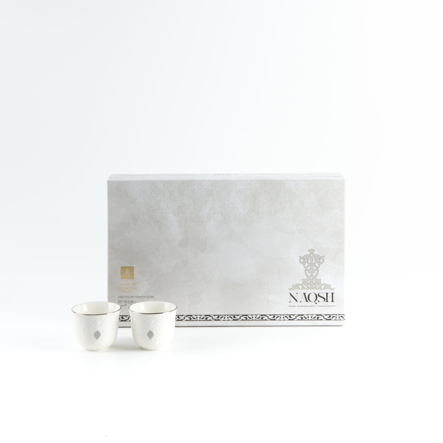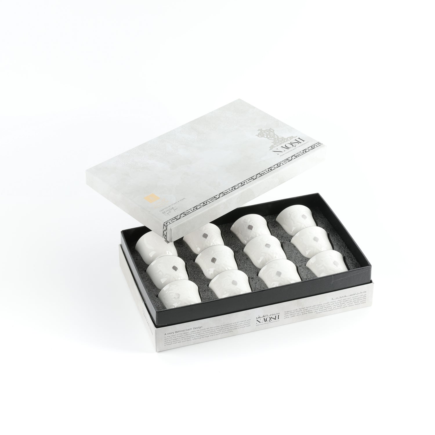 Naqsh - Arabic Coffee Cups (12-Pc)- White & Silver