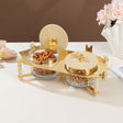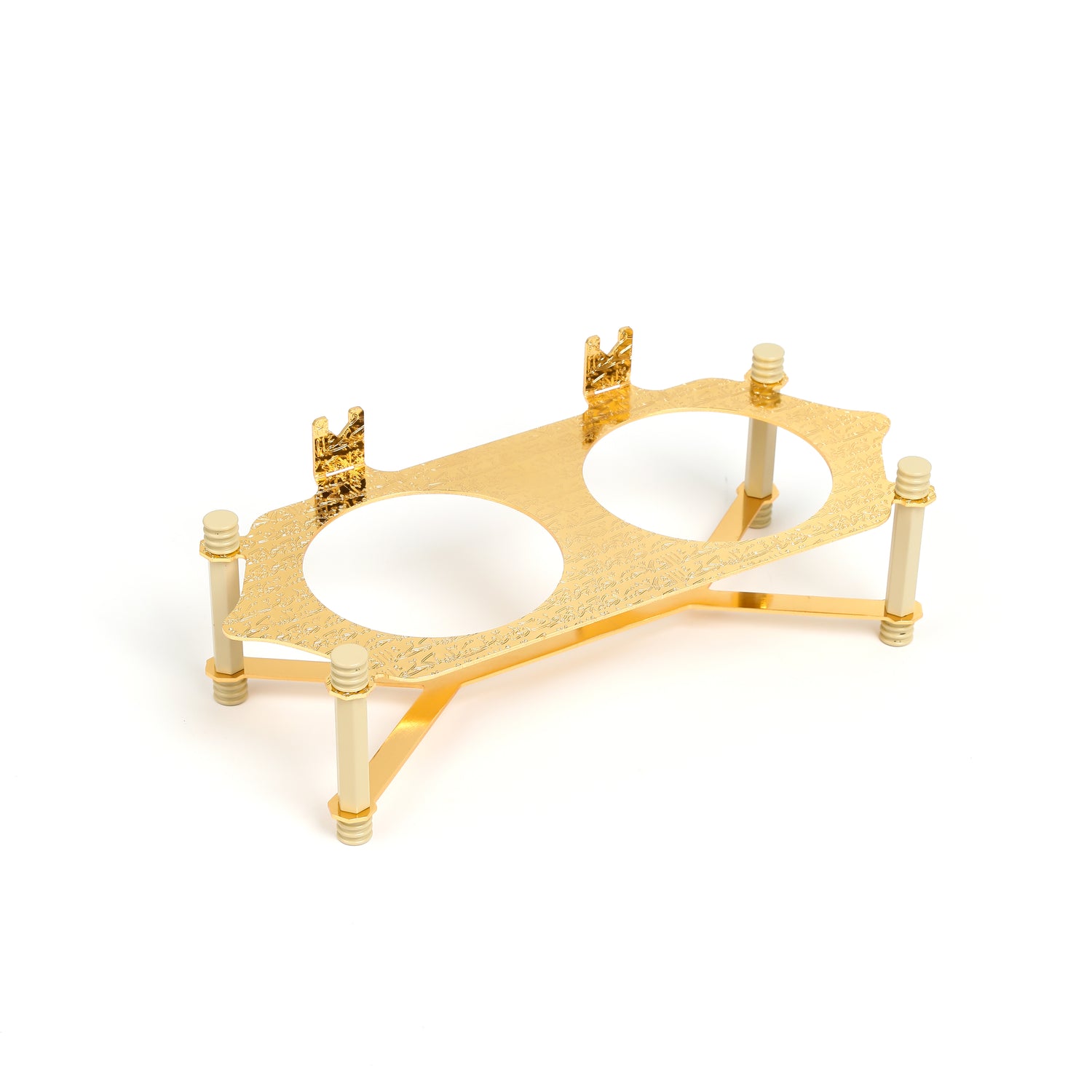 Featuring two premium glass bowls resting on a gold-plated stainless steel base with intricate Arabic engravings, it reflects the beauty of authentic heritage in every detail. The sleek black stainless steel lids, accented with gold-tone handles, provide both protection and style, keeping your selections fresh and elegantly presented.