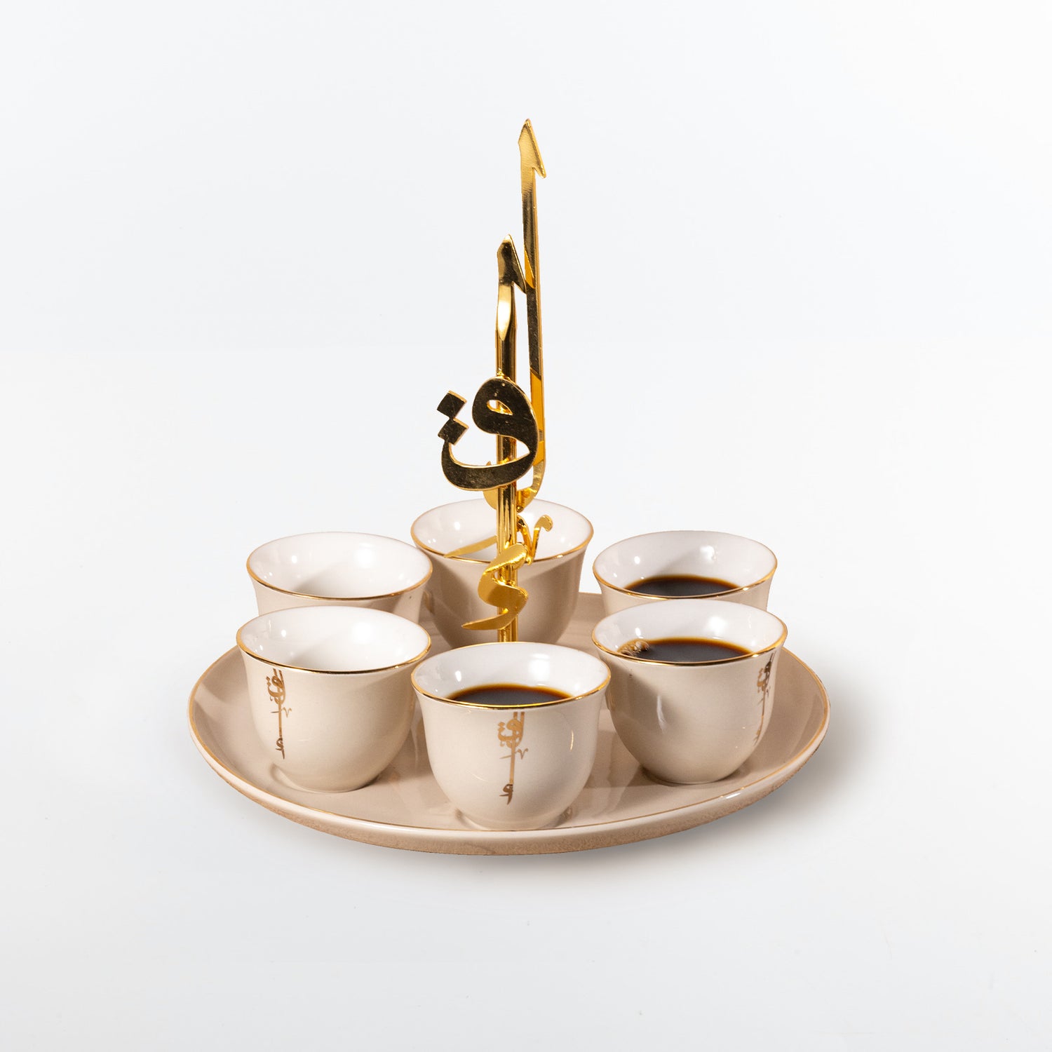 Liqa'a - Arabic Coffee Cups With Holder - Beige & Gold