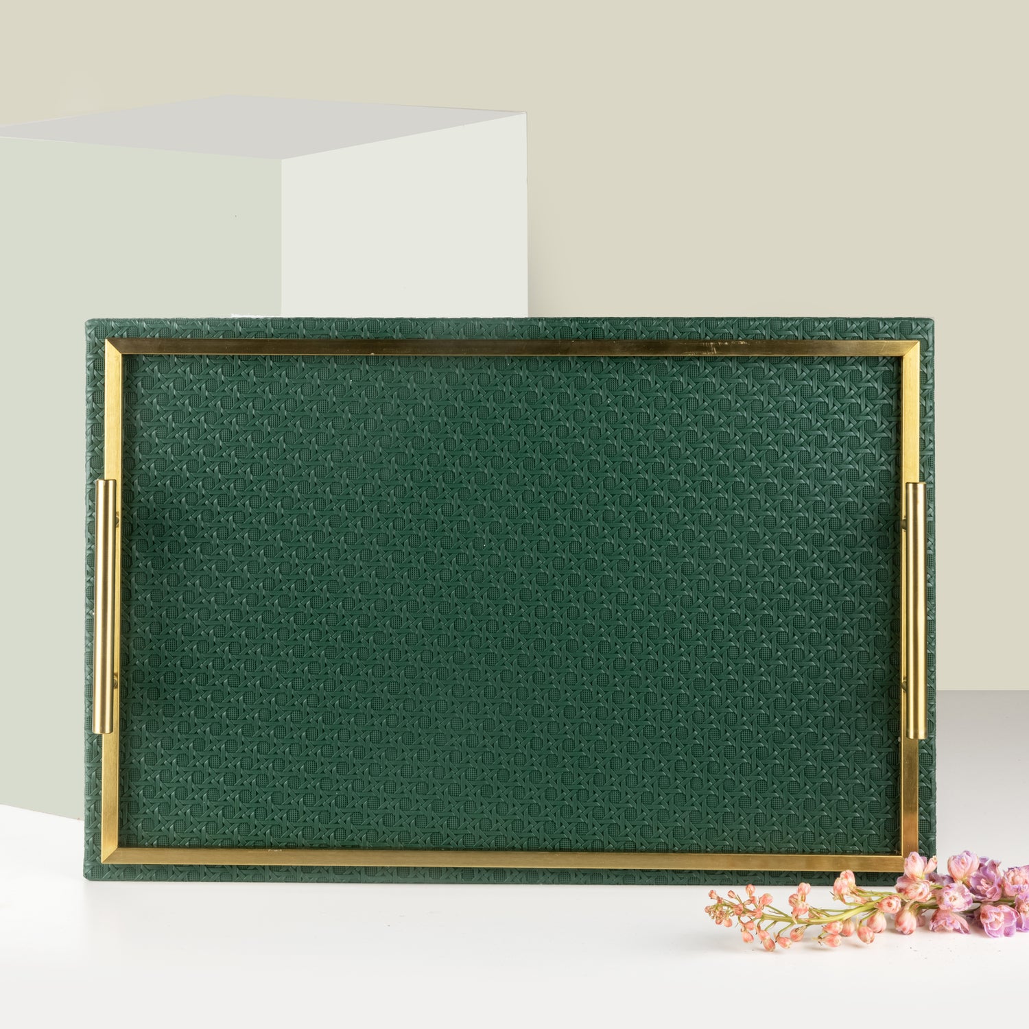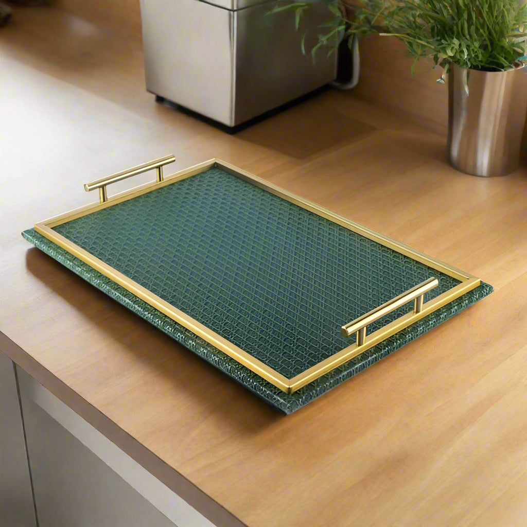 Rattan- Bandeja de servicio de cuero- Verde y oro
