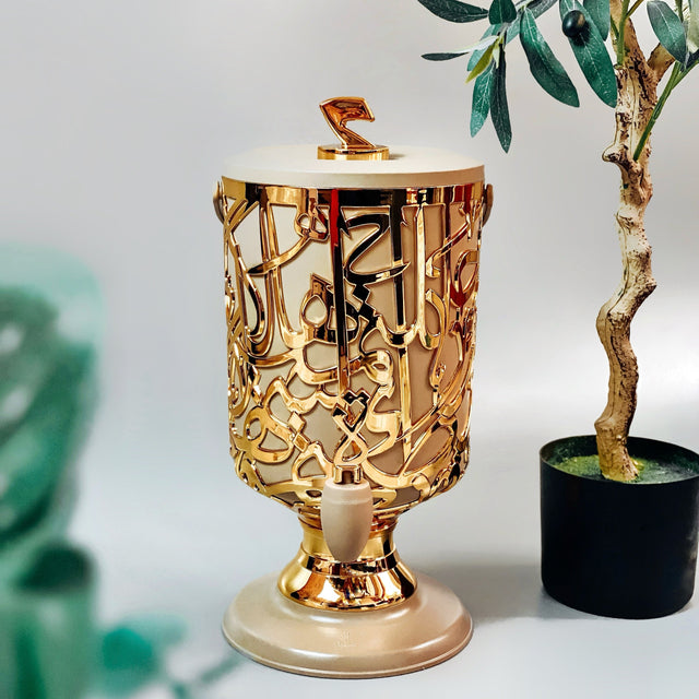 Enjoy a unique and distinctive experience in serving your juices with a Beverage Dispenser that combines luxury and art. The Dispenser takes you on a journey of creativity and distinction, as it features a design decorated with elegant Arabic letters that add a touch of welcome and originality to your table on any occasion, making serving juices an unforgettable experience. Make every moment with your relatives and friends tell a rich story through the Beverage Dispenser.