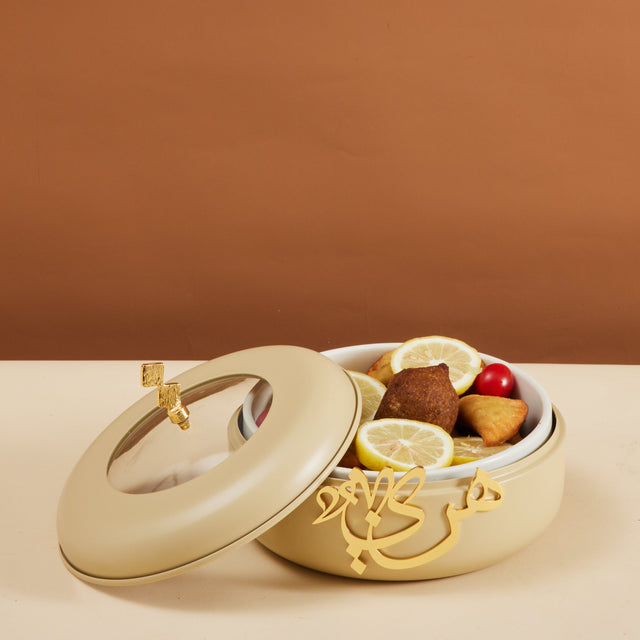 A small Buffet Server equipped with a porcelain lid that combines luxury and practicality, its design features a transparent upper that allows you to see the food inside the container.
